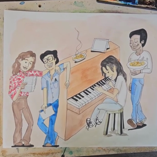 Desenhos retratando 2 momentos da vida do Lô: Conhecendo Bituca nas escadas do Levy e A criação de Para Lennon e McCartney.